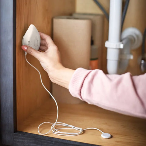 The two included Smart Leak Detectors monitor moisture, humidity and temperature. You can place them under sinks, near water heaters or behind appliances — they alert you when there’s water where it shouldn’t be, and can trigger the shutoff valve if needed.